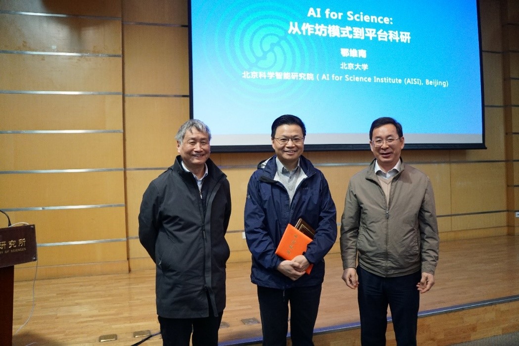 2023年4月17日,北京大学鄂维南院士访问化学所并作题为“AI for Science: 从作坊模式到平台科研”的分子科学论坛报告。王树副所长主持报告,张德清所长和刘云圻院士为鄂维南院士颁发了“分子科学论坛”荣誉证书和奖牌。