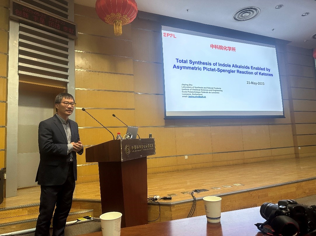 2023年5月23日,洛桑联邦理工学院祝介平教授访问化学所并作题为“Catalytic Enantioselective Pictet-Spengler Reaction of Ketones: Development and Applications in the Total Synthesis of Indole Alkaloids”的分子科学论坛。王德先研究员主持讲座,化学所党委书记、副所长范青华研究员为祝介平教授颁发了“分子科学论坛”荣誉证书和奖牌。