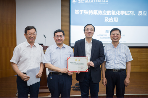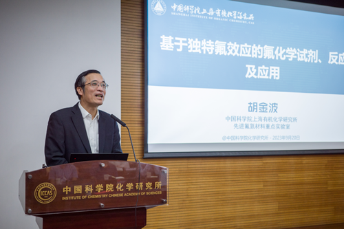 2023年9月20日,中国科学院上海有机化学研究所(以下简称上海有机所)胡金波研究员访问化学所并作题为“基于独特氟效应的氟化学试剂、反应及应用”的分子科学前沿讲座。张德清研究员主持报告,王树所长和范青华书记为胡金波研究员颁发了“分子科学前沿讲座”荣誉证书。