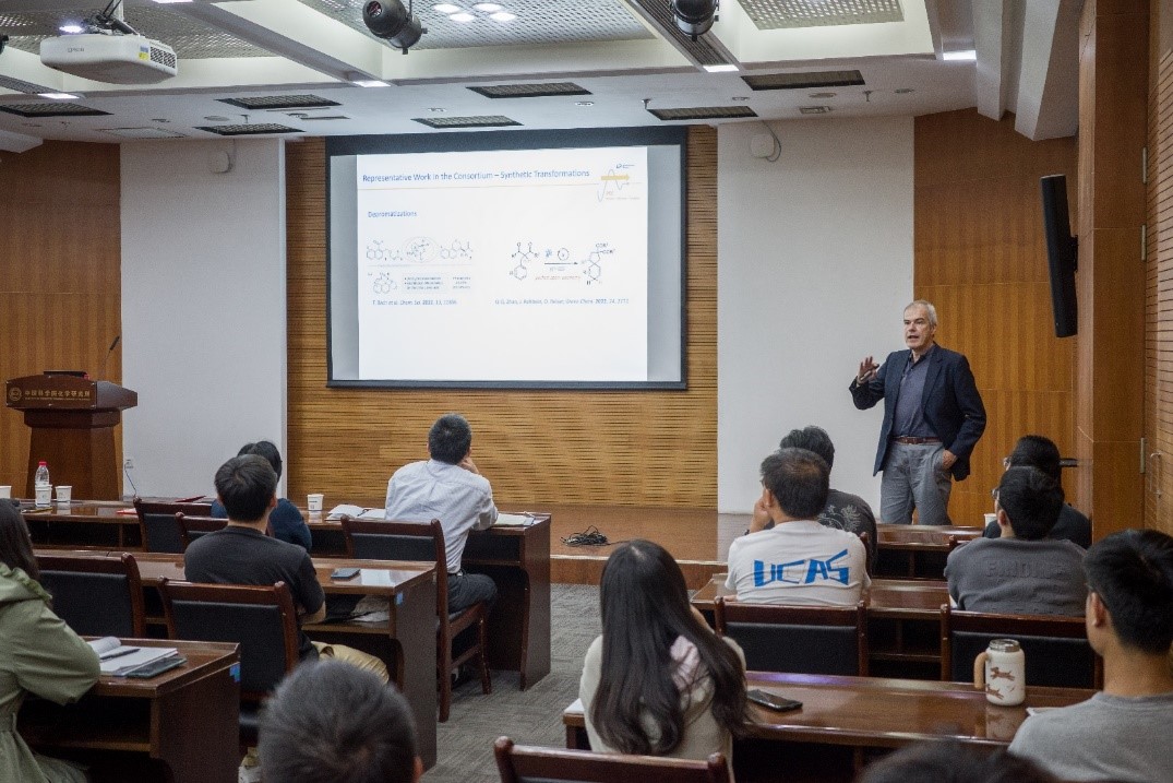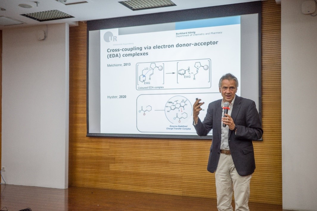 报告中,Burkhard Koenig 教授介绍了课题组在水-油界面通过光诱导电子转移实现的交叉偶联反应研究,以及通过动态自适应的镍催化协同光催化的交叉偶联反应在高效构筑化学键中的应用。Oliver Reiser教授主要介绍了课题组近年来在铜基光催化剂领域的可见光光氧化还原催化方面的研究进展,包括原子转移自由基加成反应和脱卤环化反应。报告会后,老师和同学们与两位教授进行了深入的座谈与交流,取得了良好的反响。