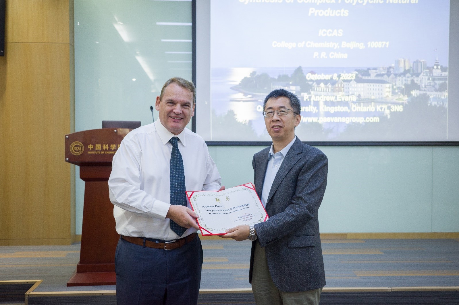 2023年10月9日,加拿大女王大学P. Andrew. Evans 教授访问化学所并作题为“Emulating Terpene Biosynthesis in the Synthesis of Complex Polycyclic Natural Products”的分子科学前沿讲座。党委书记、副所长范青华研究员主持报告,郑企雨副所长为P. Andrew. Evans 教授颁发了“分子科学前沿讲座”荣誉证书。