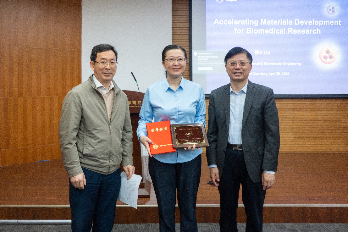 2024年4月25日,新加坡国立大学( National University of Singapore,NUS)刘斌教授访问化学所并作题为:“Accelerating Materials Development for Biomedical Research”分子科学论坛报告。报告由张德清研究员主持,党委书记、副所长范青华为刘斌教授颁发“分子科学论坛”荣誉证书和奖牌。