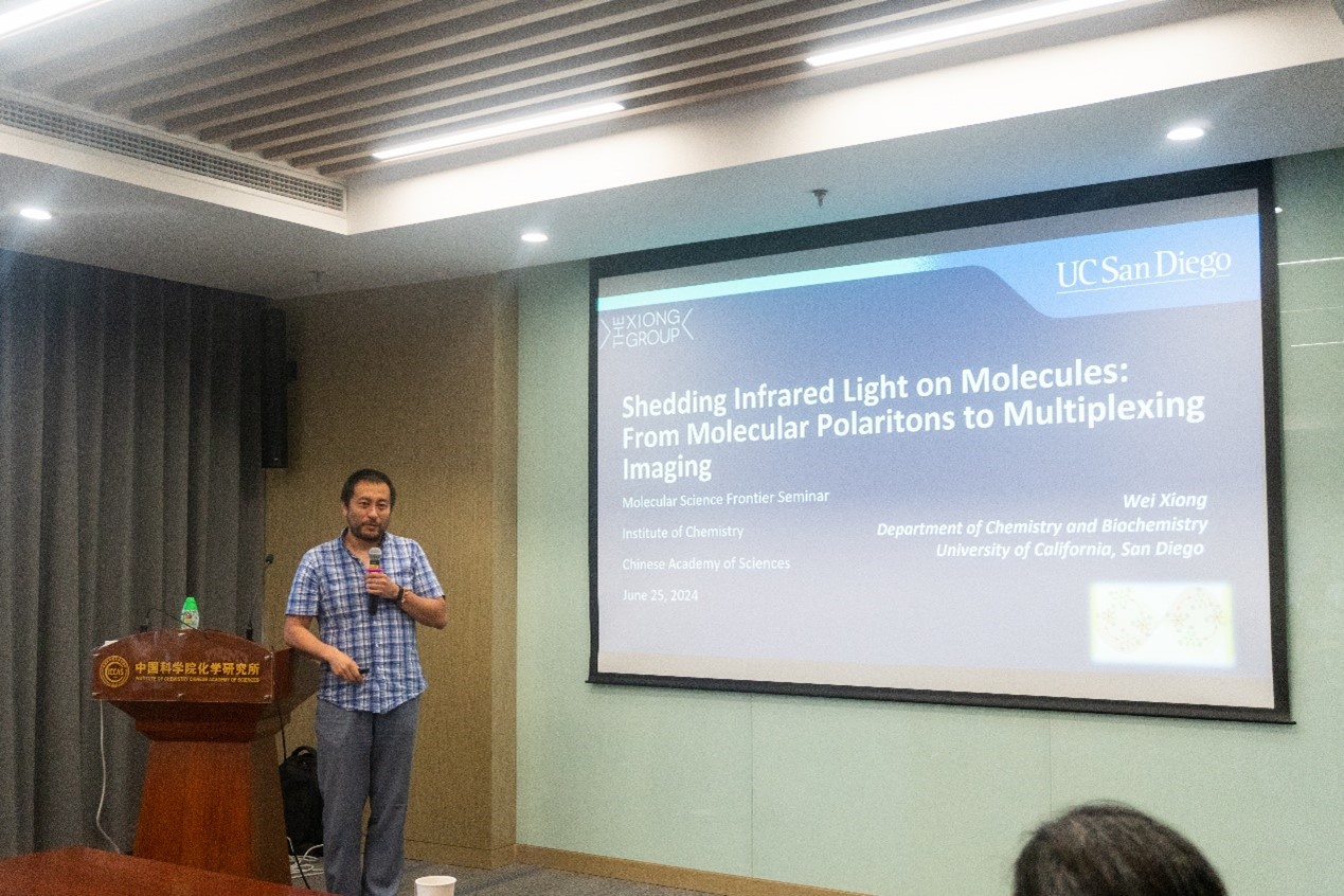 2024年6月25日,美国加利福尼亚大学圣地亚哥分校Wei Xiong教授访问化学所并作题为“Shedding Infrared Light on Molecules: From Molecular Polaritons to Multiplexing Imaging”的分子科学前沿讲座。讲座由张贞研究员主持,王树所长为Wei Xiong教授颁发了“分子科学前沿讲座”荣誉证书。