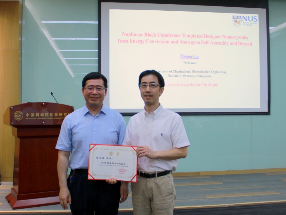 2024年7月4日,新加坡国立大学林志群教授访问化学所并作题为“Nonlinear Block Copolymer-Templated Designer Nanocrystals: from Energy Conversion and Storage to Self-Assembly and Beyond”的分子科学前沿讲座。讲座由刘冰研究员主持,王树所长为林志群教授颁发了“分子科学前沿讲座”荣誉证书。