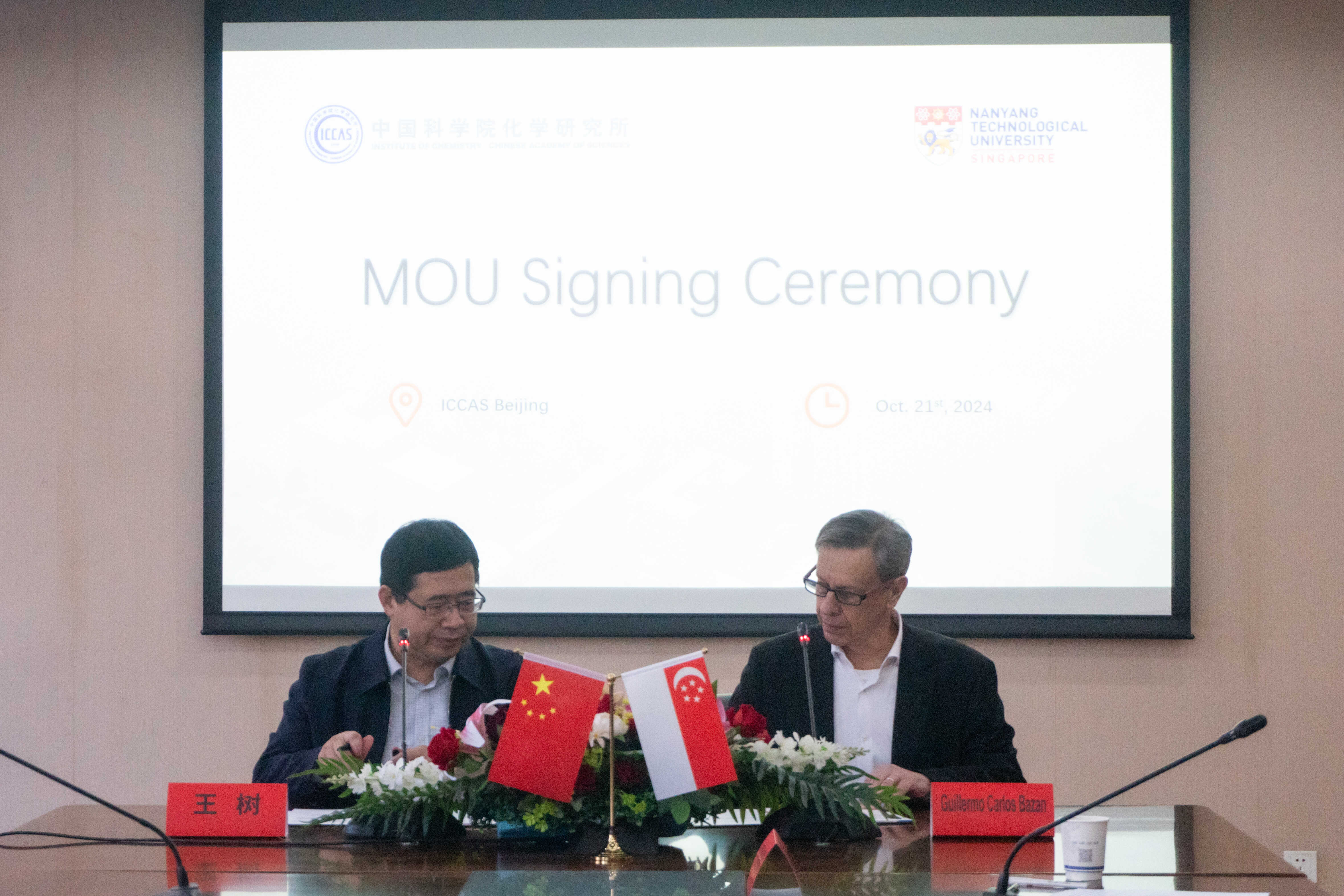 2024年10月21日,亚博888(ICCAS)所长王树与新加坡南洋理工大学IDMxS所(Institute for Digital Molecular Analytics and Science,Nanyang Technological University,IDMxS-NTU)所长Guillermo C. BAZAN共同签署了合作备忘录(MoU)。郑企雨副所长主持签约仪式,所务委员郭玉国研究员及相关管理部门负责人出席了此次签约仪式。