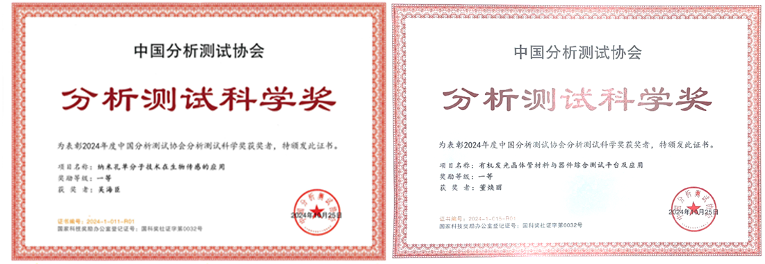 近日,2024年中国分析测试协会“分析测试科学奖”评选结果公布。化学所两项成果获得一等奖,分别为“纳米孔单分子技术在生物传感的应用”(第一完成人:吴海臣)和“有机发光晶体管材料与器件综合测试平台与应用”(第一完成人:董焕丽)。