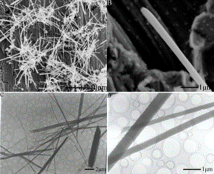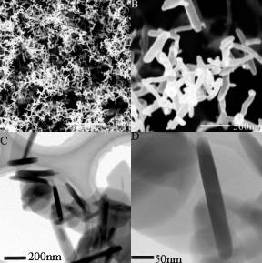 C) 大面积有机苝纳米棒TEM图像D) 单根苝纳米棒TEM图像