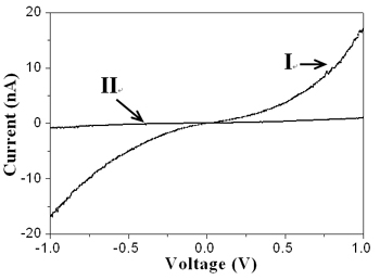图2 DMNBPDA薄膜信息存储前后的局域I-V特性曲线