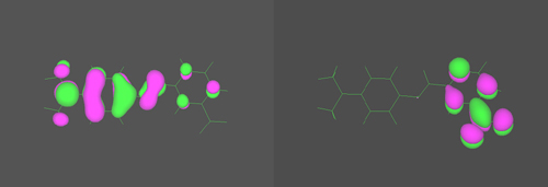 图4 杂化HF/DFT 理论(Hybrid Hartree-Fock/density-functional-theory )计算的DMNBPDA 分子最高占有轨道(HOMO)和最低空轨道(LUMO)