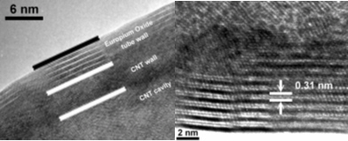 碳纳米管由于其独特的电学和力学性质,而成为极具潜力的制备纳米尺度器件材料。在碳纳米管表面用有机、无机、生物材料修饰,其物理、化学性质能发生显著改变, 赋予碳纳米管更多新的性能,使其应用领域更加广泛。稀土氧化物由于其独特的光、电、化学性质,已被广泛用于激光材料、荧光粉、催化剂。以氧化铕为代表的稀土发光材料具有优良的性能。稀土氧化物众多功能均受其形态、组成的影响,如果能得到如同碳纳米管一样的纳米级管状结构,兼具量子尺寸效应、特殊形态效应,很有可能大大增强稀土氧化物各方面的性能,具有极其重要的意义。