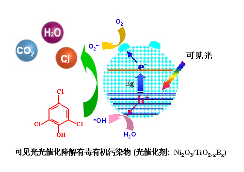 该研究组成功地利用简单的溶胶-凝胶(Sol-Gel)方法研制出新型可见光光催化剂Ni2O3/TiO2-xBx。用非金属元素B置换TiO2晶格中的部分氧,可以有效地将TiO2的吸收光谱扩展到可见光区域,同时用过渡金属氧化物Ni2O3对TiO2表面改性,可以极大地提高可见光光催化活性。非金属元素B或Ni2O3单一组分改性的光催化剂都没有可见光光催化活性,而二元协同改性,同时实现了扩展光催化剂吸收波长到可见光区域和抑制空穴/电子对复合的双重目的。用该光催化剂在可见光(波长大于420nm)照射下,以空气中氧分子为氧化剂,可将有毒有机污染物2,4,6-三氯苯酚,2,4-二氯苯酚等有效地降解为二氧化碳、水和氯离子。