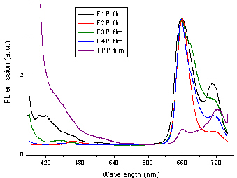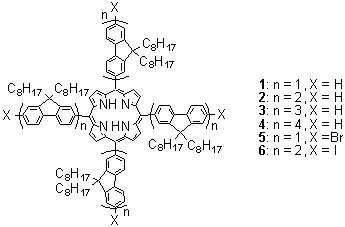 红光材料作为三原色有机发光材料之一,目前主要是通过物理掺杂的方法,将红光染料掺杂到宽带隙的主体材料中制备,能量通过空间传递 (Föster)原理从主体材料转移至红光染料。目前具有实际应用价值的红光染料很有限,卟啉是其中效率和稳定性较好的。但是因为通常的卟啉,如四苯基卟啉(TPP),其自身发光效率仅有0.11,且其掺杂浓度超过8%即发生聚集,溶解性差,使用中受到很大限制。考虑到通过化学键的能量转移速率是通过空间传递速率的近百倍,将发光量子效率很高的蓝光材料聚芴直接连接到卟啉核上,制备得到的芴臂卟啉,其本身就是一种单分子的主-客体能量转移体系,因其特殊的共轭结构和空间结构,一举解决了通常卟啉化合物荧光量子效率低、易发生聚集产生荧光猝灭、溶解性差等问题。有趣的是,这种芴臂卟啉在膜中从蓝光到红光的能量转移更为彻底,当芴臂超过一定长度时就可以得到饱和的红光,这使得其更适合于制备器件。