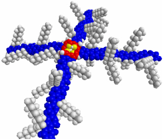 在国家自然科学基金委、科技部、中科院等的大力支持下,化学所高分子物理与化学国家重点实验室薄志山研究员领导的课题组在有机、高分子发光材料领域取得新进展。他们采用将高效蓝光材料--聚芴,通过化学键直接连接在卟啉核上的方法,制备得到了一系列单分散的星形芴臂卟啉齐聚物。这种新型卟啉聚合物外围的芴臂与卟啉核共轭连接,芴臂吸收蓝光并将能量转移至卟啉核,最终发出饱和的红光。芴臂的引入使得卟啉具有相当好的溶解性,即使在膜中也不发生聚集,发光量子效率比常用的卟啉化合物提高了一倍多。这一新进展在很大程度上解决了卟啉类化合物作为红光材料使用中的问题。该研究结果发表在国际著名化学期刊J. Am. Chem. Soc. (2004, 126, 3430-3431)上。