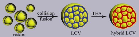 图2 形成复合囊泡的可能机理:首先嵌段共聚物自组装形成囊泡,但由于在该条件下囊泡表面自由能太高不稳定,倾向于聚集并熔合,以减小表面积直至稳定。在加入了催化剂后,反应性聚合物壁凝胶化,形貌被固定下来。(蓝色表示PTMSPMA部分,红色表示凝胶,黄色表示PEO部分)
