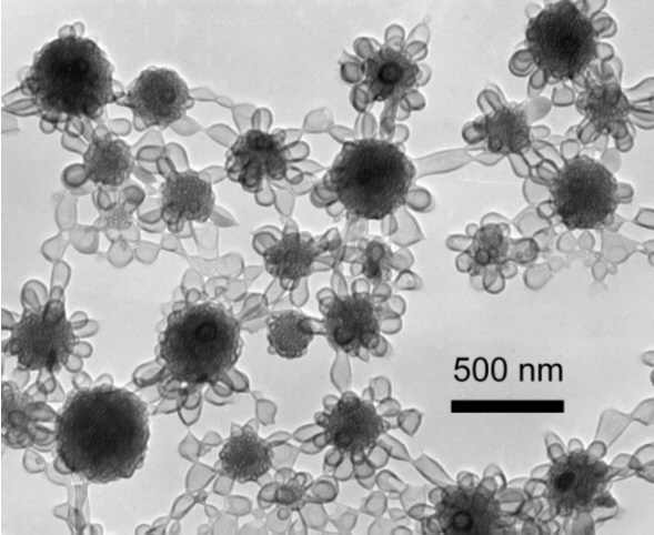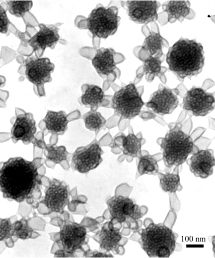 图4 在较高聚合物浓度下形成的杂化复合胶囊的透射电子显微镜结果,呈现出向日葵花的图案
