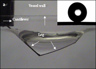 a, 虫腿在刺穿水面前的最深水窝侧面图,接触角167.6±4.4°