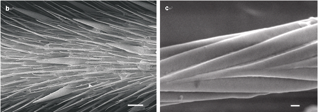 b, c, 水黾腿的扫描电镜SEM照片,(b)水黾腿的无数细长微刚毛,20μm,(c)单根刚毛上的精细螺旋状的纳米凹槽结构,200 nm