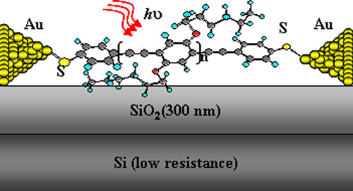 在中国科学院、国家自然科学基金委和科技部的支持下,化学所有机固体院重点实验室胡文平研究员、刘云圻研究员、朱道本院士与日本电话电讯株式会社合作,合成了一种既具有一定刚性,又带有自组装端基的聚苯乙炔类分子。他们采用电化学沉积技术制备了纳米间隙的金电极对,结合电场诱俘和稀溶液自组装技术,成功地制备了基于共轭聚合物的纳米器件。其研究结果表明,这种聚合物纳米器件具有良好的光电响应行为,其对光的响应速度达400Hz,是一个纳米尺度的理想光开关。同时,该纳米器件表现出理想的p-型场效应晶体管的性能,在低温下观察到类似单电子的响应行为。这一研究结果为共轭聚合物在纳米电子器件中的应用开拓了新的思路。