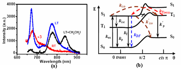 研究发现稳定的反式Cy5分子被激发到激发单线态后,分别被光异构到顺式基态和三线态,由于简并的顺式三线态与反式单线态势能面的能量差与热活化能(kT)相当,处于顺式三线态的分子可以通过热诱导的作用回到反式的单线激发态而发出延迟荧光。这一结果对了解Cy5分子的三线态性质和顺反异构化过程及其在单分子光谱测量中的应用具有重要意义。相关研究结果已经发表在近期《美国化学会志》(J. Am. Chem. Soc. 2005,127, 8064-8066)上。