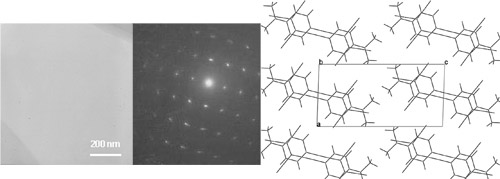 A) TDMEE薄膜的TEM图像及选区电子衍射;B)分子在晶态薄膜中的排列方式