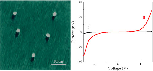 A) 通过STM针尖在TDMEE薄膜表面施加电压脉冲形成的由五个信息点组成的字母“v”,信息点平均直径2.1 nm; B) 薄膜信息存储前后的局域I-V特性曲线 I)未记录区 II)记录区