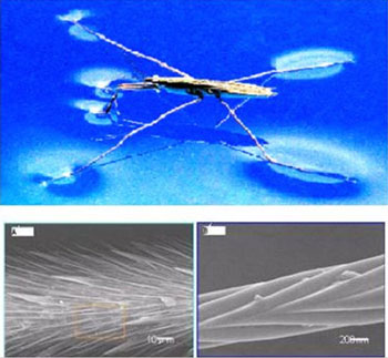 (3)在规模化制备方面:采用电纺技术制备由纳米纤维 “捆绑”的多孔微球类荷叶状结构仿生超疏水聚合物荷叶薄膜 (Angew. Chem. Int. Ed. 2004, 43, 4338);仿照水稻微米结构排列方式制备出三维各向异性的碳纳米管微结构阵列 (J. Am. Chem. Soc. 2004, 125, 14996);与化学所徐坚研究员合作采用一步涂敷法,成功制备了具有类似于荷叶的微米/纳米复合多级结构的超双疏聚合物涂层 (Adv. Mater. 2004, 16, 302);模拟蝉翅膀表面的微观结构制备了超疏水聚合物纳米柱膜 (ChemPhysChem 2004, 5, 750);仿照壁虎脚底刚毛结构制备具有高粘附力的超疏水聚苯乙烯薄膜 (Adv. Mater. 2005, 17, 1977)(Nature, 2004, 432,36)。
