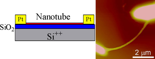 该研究把这种微电子学中的掺杂技术扩展到纳米电子学中。首先制备了氮掺杂的多壁碳纳米管,然后利用聚集离子束技术制备了基于单根碳纳米管的场效应晶体管。氮掺杂的碳纳米管显示n-型半导体特性,电子迁移率高达