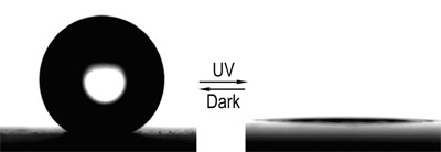 仿生智能超疏水/超亲水“开关”由于其在基因传输、无损失液体输送、微流体、生物芯片、药物缓释等领域具有极为广阔的应用前景而倍受关注。化学所有机固体实验室功能界面材料小组在实现了具有“光”、“热”响应的“超疏水/超亲水”智能“开关”表面后,又以氧化钛为原料,研制出具有工业应用前景的 “光开关”材料,相关研究结果发表在近期的Angew. Chem. Int. Ed. 2005, 44, 5115-5118上。