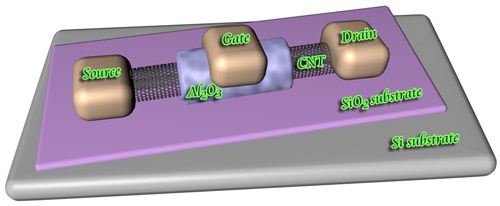 图2 利用部分包覆绝缘层的碳纳米管制作的场效应晶体管示意图