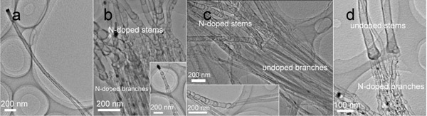 b:主干:氮掺杂;分支:氮掺杂;c: 主干:氮掺杂;分支:未掺杂;d:主干:未掺杂;分支:氮掺杂。