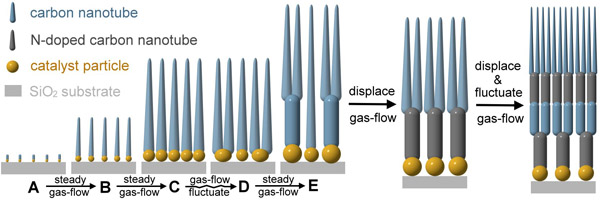 碳纳米管因其优良的电学和机械性能目前已经广泛地被用来制作多种纳米电子器件,但是如何将这些独立的电子器件连接成一个功能系统,如纳米电路等,仍是纳米电子学领域的一大挑战。该课题组提出了一种新的制备方法来解决这一难题。他们发现气流波动能可控地制备分支碳纳米管阵列。同时通过改变气流的成分就可以控制分支碳纳米管中各部分的化学组成(图3)。据此,他们提出了分支碳纳米管形成的一种新机制(图4)。这种方法简单可控,为分支碳纳米管用于制备未来的纳米集成电路提供了可能,并可能用于制备其它材料的分支纳米结构,对分支纳米结构的制备和纳米器件的集成具有重要意义。