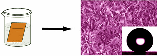 在前期工作中,该小组研究人员结合电沉积和自组装单层技术有效控制了金属铜表面的浸润性(ChemPhysChem 2005, 6, 1475-1478)。在此基础上,利用生物矿化启发的形貌生成技术,成功发展了一步浸泡法,在金属表面构筑了非常稳定的超疏水薄膜(接触角约为162°,滚动角小于5°),并以金属铜为例做了详细介绍。一步浸泡法的特点是:方法简单,廉价,可大面积制备,得到的超疏水薄膜具有很好的环境稳定性(暴露在空气中几个月保持性质不变,即使遇到有机试剂也能保持很好的超疏水性)。该研究结果对于金属的自清洁和防腐蚀有着重要的实际意义。