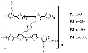 该课题组设计和合成了一系列带共轭支链(苯乙烯或噻吩乙烯支链)的支链共轭聚噻吩,通过调节共轭支链的长度以及聚噻吩主链上带共轭支链噻吩单元的比例,得到在可见区具有宽吸收和强吸收系数的聚噻吩衍生物(Macromolecules, 2006, 39: 594-603;Chem.Commun.,2006, 871-873)。合成了一种带二噻吩乙烯支链的聚噻吩显示一个380nm~650nm的宽而强的吸收峰(图2中的P3),使用这种聚合物与C60衍生物PCBM共混(重量比1:1),制备的聚合物太阳能电池在模拟太阳光(AM1.5, 100 mW/cm2)下的最高能量转化效率达到3.18%,比当前广泛使用的聚(3-己基噻吩)(P3HT)在同样实验条件下的能量转换效率提高38%,为新型共轭聚合物材料的最高水平 (J. Am. Chem. Soc., 2006, 128: 4911-4916),此项结果标志着我国聚合物光伏材料的研究进入国际先进行列。另外,该组最近在高迁移率共轭聚合物材料方面也取得了可喜进展,设计和合成了一种带共轭桥连的交联型聚噻吩衍生物(图3),含5%共轭桥的聚合物的空穴迁移率比不含共轭桥时提高了两个数量级,其光伏性能也有明显提高(Macromol. Rapid Commun. 2006, 27: 793–798)。