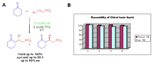 官能化手性离子液催化的不对称Michael反应(A)及其回收利用效果 (B)