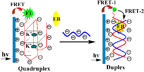 共轭聚合物检测G四聚体DNA到双螺旋构象转化的原理图