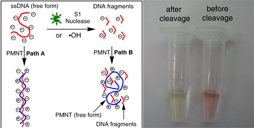 利用阳离子聚噻吩的变色效应,肉眼可视检测核酸酶水解DNA以及羟基自由基损伤DNA的原理图