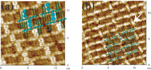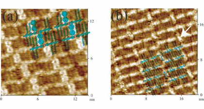 研究人员首先将分子模板和欲分散物种制成分子薄膜,利用高分辨扫描隧道显微技术,发现客体分子蒄、生物分子三肽和ZnS纳米颗粒与主体分子OPE在石墨电极表面可以形成共吸附的复合结构。通过控制客体分子蒄与主体分子之间的比例,成功实现了蒄分子在OPE分子模板中分散度的控制,使一个、两个蒄分子,或一个和两个蒄分子交替分散在OPE分子形成的空穴中(如图a所示);三肽分子则以两个为单元均匀分散在相邻OPE分子共轭链的空穴中(如b图中的箭头所示)。该研究为探讨分子在电极表面的分散、吸附位置和存在状态提供了直接的实验依据,对研究有机和生物分子在固体表面的可控分散具有重要意义。