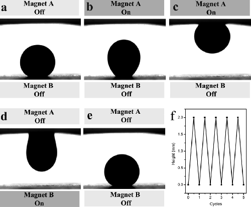 在前期工作中,该研究组发现超疏水性阵列PS纳米管膜对水滴具有较强的粘滞作用,可以充当“机械手”,将微量水滴从超疏水表面运输到普通的亲水表面上(Adv. Mater. 2005, 17, 1977)。在这一工作基础上,他们利用超顺磁性微滴对外加磁场的灵敏响应性,进一步开发出具有高粘滞力的超疏水表面在可逆、无损失输运超顺磁性微滴方面的应用。这种智能、可逆、无损失输运少量微滴的体系设计,对许多定域的化学生物反应、痕量分析和在位检测非常重要,为少量(或微量)液滴在物理、化学、生物、医药、临床和微流体领域中的应用提供了新的思路,并为实现商品化提供了的可能。