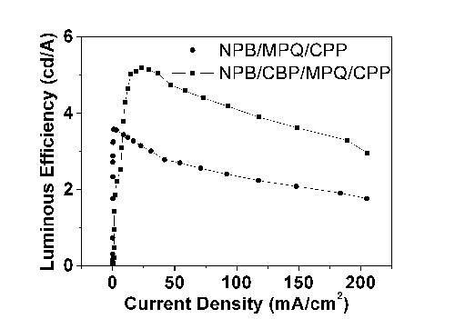 该课题组合成了具有强吸电子能力的蓝光电子受体材料2,3–二氰基–5,6–二–[4–(2,3,4,5–四苯基)苯基]–苯基吡嗪(CPP,分子结构如图1中插图),并用该化合物作为电子传输兼发光层应用于有机电致发光器件中。通过合理地设计器件结构(图1),向空穴传输层与发光层之间引入6,7–二甲基–2,3–二–[4–(2,3,4,5–四苯基)苯基]–苯基喹喔啉(MPQ)作为激基复合物消除层,可以有效地抑制器件中激基复合物的生成得到高效的蓝光发射(图2)。制备的蓝光器件具有高的发光效率(5.2 cd/A,图3)及亮度(6230 cd/m2)。此项研究为制备高效的基于强电子受体材料的蓝光有机电致发光器件提供了一个有效的方法。