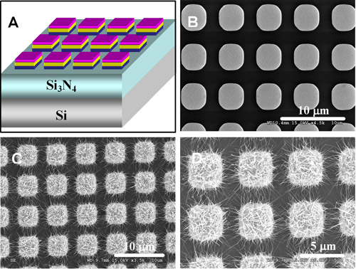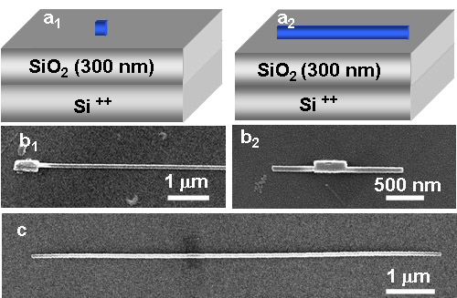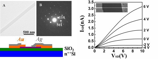 在中国科学院、国家自然科学基金委、国家科技部的支持下,化学所有机固体院重点实验室在此前CuTCNQ单晶纳米材料控制合成(J. Am. Chem. Soc.2005, 127, 1120-1121; Adv. Mater. 2005, 17, 2953-2957)的基础上,结合物理气相传输生长高质量有机单晶的经验(Adv. Mater. 2006, 18, 65-68),以物理气相传输和原位化学反应相结合的方法,大面积生长了CuTCNQ的单晶纳米带。并以此为契机,与微电子所刘明研究员等合作,发展了一种构筑有机纳米器件和纳米器件阵列的方法。器件的测试结果证明:隶属于相I的这种CuTCNQ单晶纳米带表现出半导体的特性,这为CuTCNQ开关和存储机理的进一步研究打下了基础。有关研究结果发表在近期《美国化学会志》(J. Am. Chem. Soc. (2006, 128, 12917-12922)上。