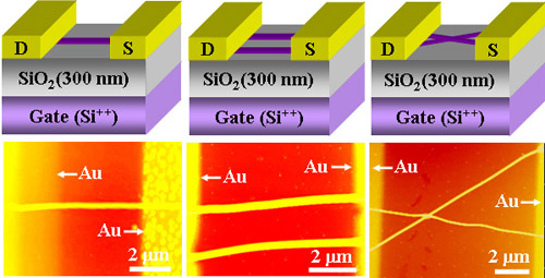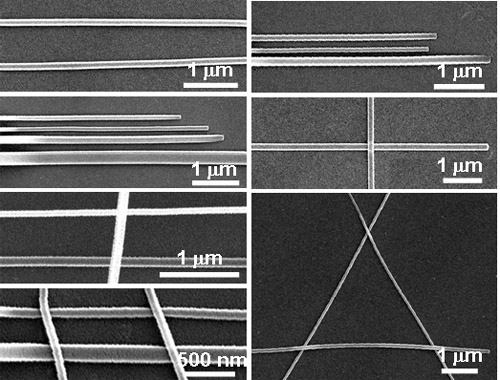 随着纳米科学的发展,对一维纳米材料进行有效的排布成为一个研究热点,也是是纳米电路的核心。国际上对纳米碳管的大量研究,有力地推动了纳米电子学的发展。化学所有机固体院重点实验室在此前有机单晶纳米带控制生长的经验基础上,采用晶核原位外延的方法得到了紧贴SiO2基板生长的有机半导体单晶纳米带。通过控制原始晶核的取向控制纳米带的外延生长方向,最终得到平行的、交叉的等各种基于有机半导体单晶的纳米复杂结构。单晶的完美结构也为进一步开展有机半导体单晶纳米电路的研究打下了基础。有关研究成果已经发表在近期的《先进材料》上(Adv. Mater. 2006, 18, 3010-3014)。