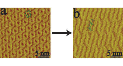 在国家自然科学基金委、科技部和中国科学院的支持下,化学所分子纳米结构与纳米技术院重点实验室的研究小组,近年来系统研究了寡聚噻吩分子的组装规律和组装结构。利用高分辨扫描隧道技术(STM),发现寡聚噻吩分子不仅本身可以形成稳定的组装结构,还可以用这种组装结构作为分子模板,对其它分子的排列和分布进行调控(Langmuir, 2006, 19, 10128; J. Am. Chem. Soc. 2006, 128, 12384; J. Phys. Chem. B 2005, 109, 19859 & 2006, 110, 17043)。在前期工作基础上,最近,该课题组又深入研究了烷基桥连双寡聚噻吩分子4T-tm-8T和4T-tm-4T 等分子(4T: quarterthiophene; tm: trimethylene; 8T: octithiophene)的组装结构和相转变,发现了双寡聚噻吩分子吸附结构的多样性和结构转化规律。部分结果发表在近期的美国科学院院刊上(Proc. Natl . Acad. Sci. USA,2007,104,3707–3712)。
