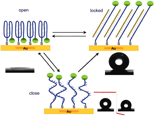 研究过程中他们注意到,对于以上这些由无机氧化物或有机分子构筑的响应表面,大多遵循熵驱动的开关过程。而在生命现象和分子识别行为中,焓驱动的过程占有十分重要的地位。在很多情况下,生物分子都是经历了从一种有序状态到另一种有序状态的焓驱动的转变过程,这种特异的一对一的分子识别特性,为智能纳米器件的设计提供了可能。