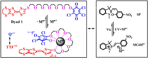 最近,他们成功地设计、合成了一系列含有四硫富瓦烯、醌单元的新型D-A分子,并报道了金属离子可以诱导该类D-A分子发生的分子内电子转移反应。与生命分析化学实验室、光化学实验室等研究人员合作,通过电化学、紫外光谱、ESR等方法研究表明:金属离子(Pb2+、Zn2+、Sc3+ )与醌负离子自由基及半冠醚链协同的络合作用稳定了电荷分离状态进而驱动了分子内电子转移的发生。更为有趣的是,利用螺吡喃分子的开环状态对金属离子有较强络合作用的性质,这种分子内电荷转移可以在螺吡喃存在的情况下通过紫外/可见光照进行可逆调控。研究结果发表于J. Am. Chem. Soc. 2007, 129, 6839-6846。