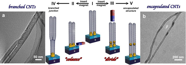 该课题组曾发现“气流波动化学气相沉积法”,即通过改变气流的流量或成分能可控地制备分支结构碳纳米管阵列,及调控分支结构碳纳米管各部分的化学组成(Nano Lett., 2006, 6, 186)。随后,他们选用不同的衬底,实现了铁填充碳纳米管的可控制备(Adv. Mater., 2007, 19, 386)。在这些工作的基础上,他们在传统的化学气相沉积法制备碳纳米管的过程中引入一个外加磁场,制备出了分支结构以及填充结构的碳纳米管。根据这一发现,他们提出了分支结构以及填充结构碳纳米管形成的新机制(如图),即在垂直方向磁场的作用下催化剂粒子发生合并生长出分支结构碳纳米管,在平行方向磁场的作用下催化剂粒子发生分裂生长出填充结构碳纳米管。这一发现有助于增加人们对磁场作用下化学气相沉积法的认识,并且提供了一种简单有效的方法制备分支结构以及填充结构碳纳米管,为纳米电路的研究提供了材料基础。