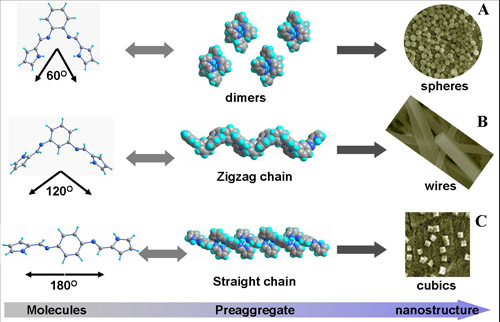 除了构筑方法,在有机低维结构的形成机制方面,为了研究分子结构决定的分子间各向异性相互作用对不同尺度下分子聚集过程的影响规律,研究人员在前期工作的基础上(Angew. Chem. Int. Ed. 2004, 43, 4060 - 4063),设计、合成了三种同分异构的有机小分子,并发现三种异构体形成截然不同的纳米结构:纳米球,纳米线和纳米方块。通过比较不同同分异构分子簇集形成的预聚体,发现了分子结构与低维结构形貌之间的内在关联性。相关研究工作作为热点文章发表于(Chem. Commun.2007, 1623 - 1625)。随后被英国皇家化学学会综合评述杂志(Chemistry World2007, 4(5),C35)以Research Highlights形式报道,认为是向理性化设计有机纳米材料迈进了一步,被Nature Nanotechnology在互联网上以Research Highlights(DOI:10.1038/nnano.2007.129)形式进行了评论;又被美国化学学会(Chemical & Engineering News2007, 85(19),p54)选作科技焦点文章Science & Technology concentrates。
