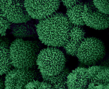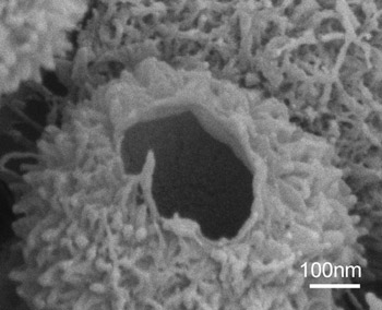 研究人员在具有自主知识产权的“无模板”法制备微/纳米结构导电聚合物的基础上,在没有添加任何有机或无机酸掺杂剂的条件下,通过改变氧化剂的氧化还原电位,成功地实现了导电聚苯胺纳米纤维尺寸的可控制备,并总结出定性的经验公式,为导电聚合物纳米结构的自组装和可控的制备开辟了一条简单、易行的方法(Adv. Mater. 2007, 19, 465)。随后,他们选择有机氟磺酸为掺杂剂,用无模板法制备了聚有仿红毛丹结构的空心聚苯胺微球,并提出了分别以氟磺酸的球形胶束和苯胺盐的胶束为模板的协同效应的自组装机理。该导电聚苯胺空心微球表现出优异的超疏水性能,不仅提高了导电聚苯胺的导电率的稳定性,而且还能保护腔体中的生物材料等不被污染和破坏。该具有超疏水的聚苯胺空心微球,在生物、药物等的无能量损失传输、微反应器、可控分离和释放等领域具有广泛的应用前景。