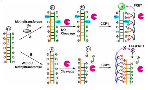 图1. DNA/核酸酶相互作用检测以及DNA甲基化检测原理图
