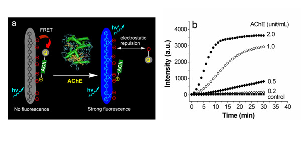 研究人员还发展了高灵敏度的蛋白酶活性检测和抑制剂筛选新体系。通过静电相互作用构建共轭聚合物/酶底物分子体系,利用酶分子作用前后聚合物聚集态变化而导致的荧光信号改变实现了对酶活性的灵敏检测,目前这种检测方法可以对碱性磷酸酶以及胰蛋白酶活性进行分析。该体系还可以用于酶抑制剂筛选(J. Mater. Chem. 2007, 17, 4147-4152)。最近,他们又设计、发展了基于共轭聚合物的乙酰胆碱酯酶活性和抑制剂筛选检测体系。利用乙酰胆碱酯酶分子作用前后聚合物的荧光信号增强对酶活性进行检测,并实现了对乙酰胆碱酯酶抑制剂的高灵敏度筛选。这些方法为快速灵敏检测酶活性提供了简便的混合检测技术,有望用于具有抑制酶活性的新药筛选(Angew. Chem. Int. Ed. 2007,46, 7882-7886)。