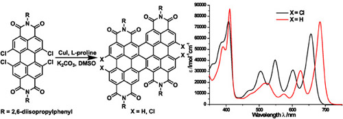 苝-3,4:9,10-四羧酸二酰亚胺(苝酰亚胺)是一类极具研究价值的电子传输材料,在有机发光二极管﹑太阳能电池﹑有机场效应晶体管等方面都得到了广泛的研究和应用。因此,以苝酰亚胺为基本单元通过设计与合成可以构建得到具有新颖结构和特殊性质的高性能n型半导体材料。研究人员以四氯苝酰亚胺为原料通过Stille反应合成得到了双噻吩掺杂的苝酰亚胺衍生物,同时发现这一类化合物在固态的自组装行为可以通过客体分子进行调控。相关研究成果被选为封面文章发表在化学通讯(Chem. Comm., 2006, 4587-4589)上。在此工作基础上,研究人员通过进一步研究发现了一种高效活化四氯苝酰亚胺的过渡金属体系,利用该体系通过偶联反应将两分子苝酰亚胺沿其分子短轴结合在一起,合成出全共轭的二并苝酰亚胺类化合物。这类化合物在可见光范围有宽谱吸收,电化学研究表明其优良的电子受体特性,有望作为新型的电子传输材料。相关工作已申请中国专利,初步结果发表于J. Am. Chem. Soc., 2007, 129, 10664—10665。